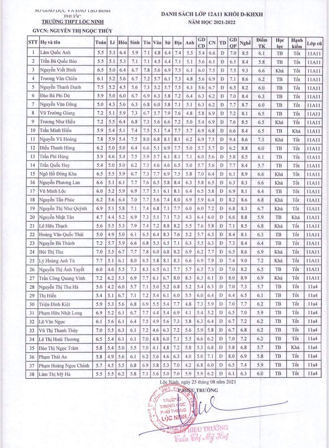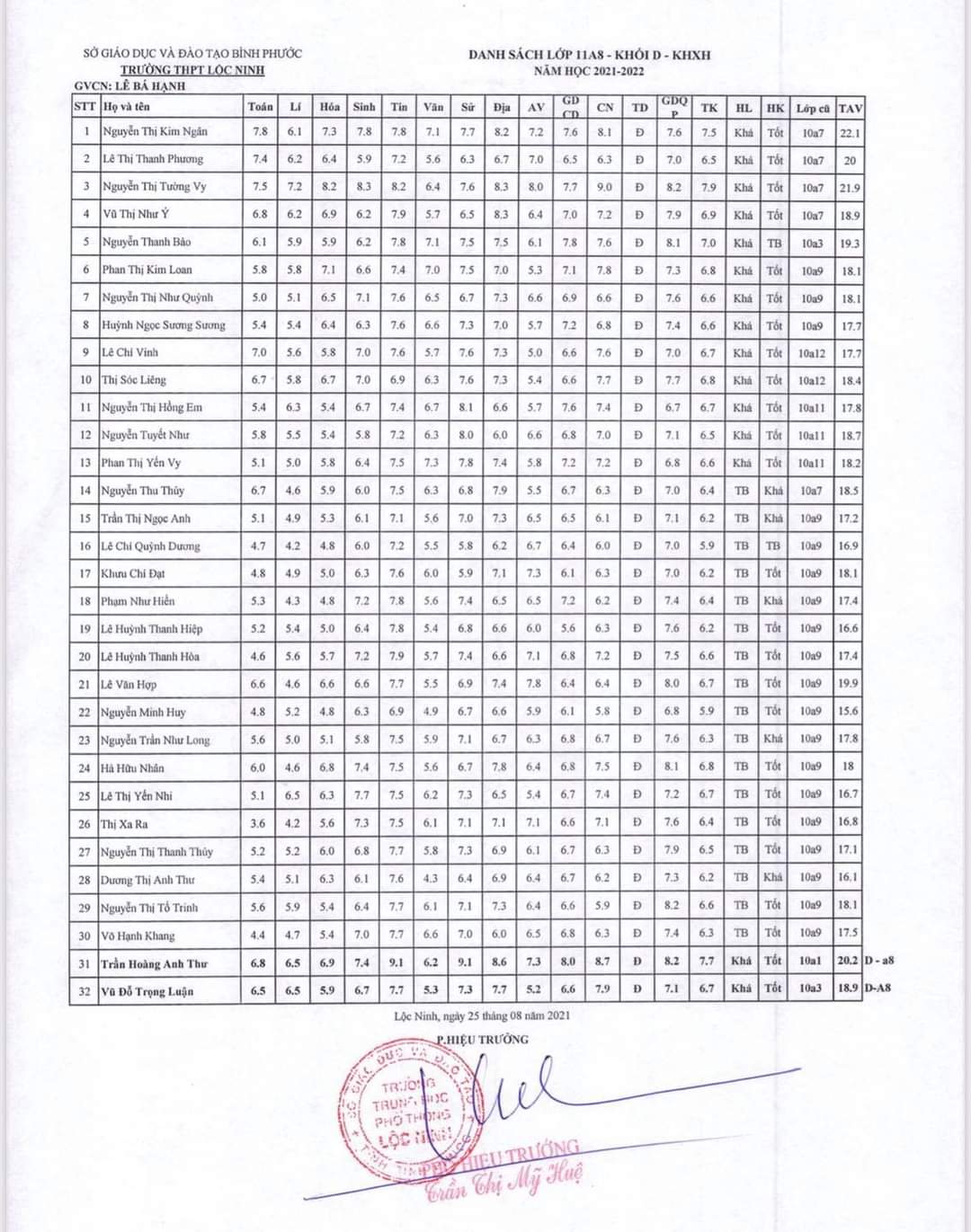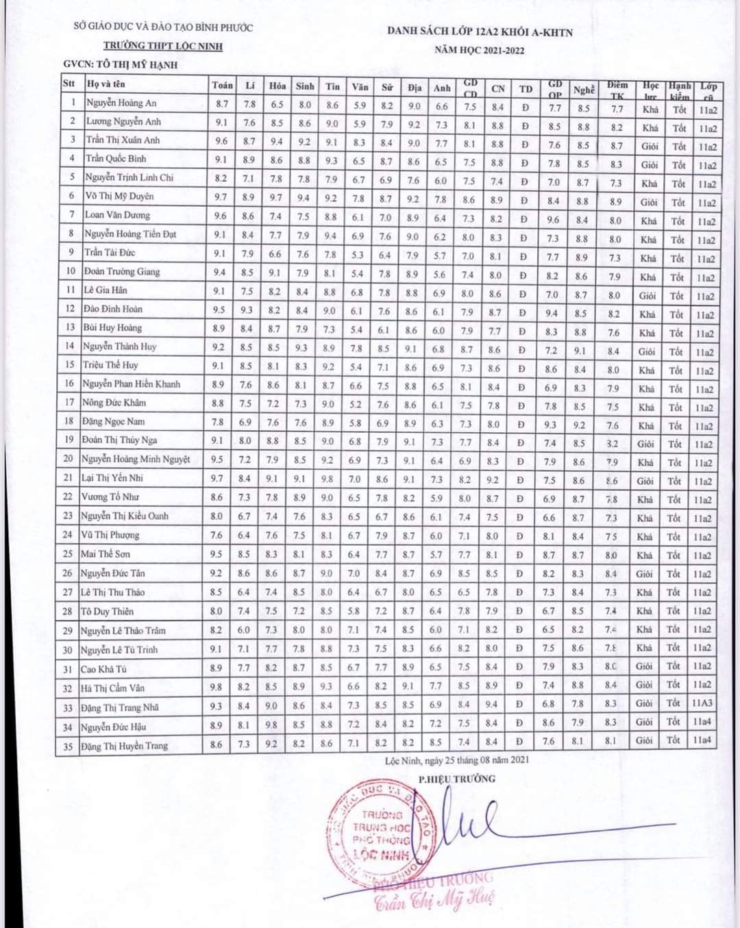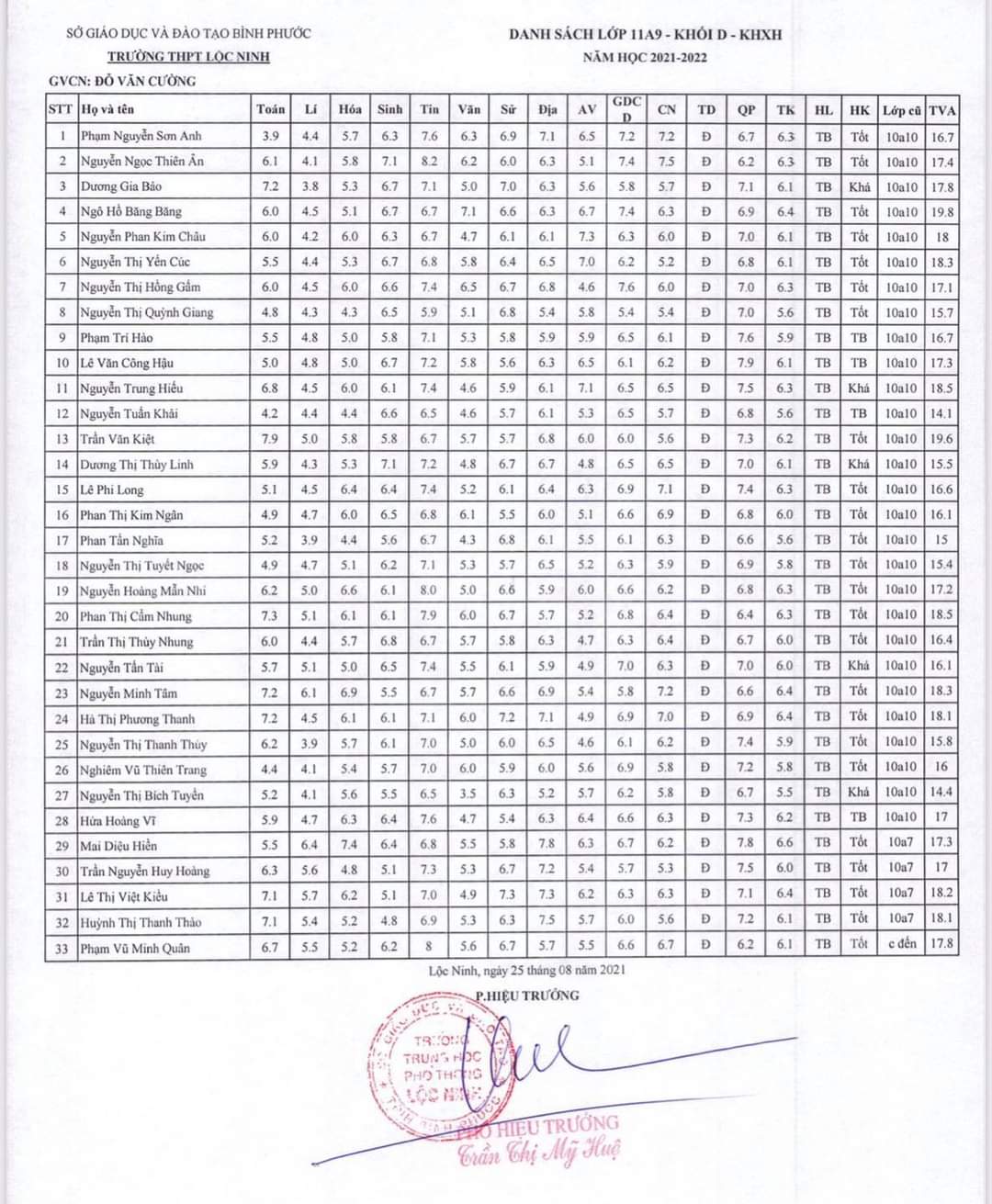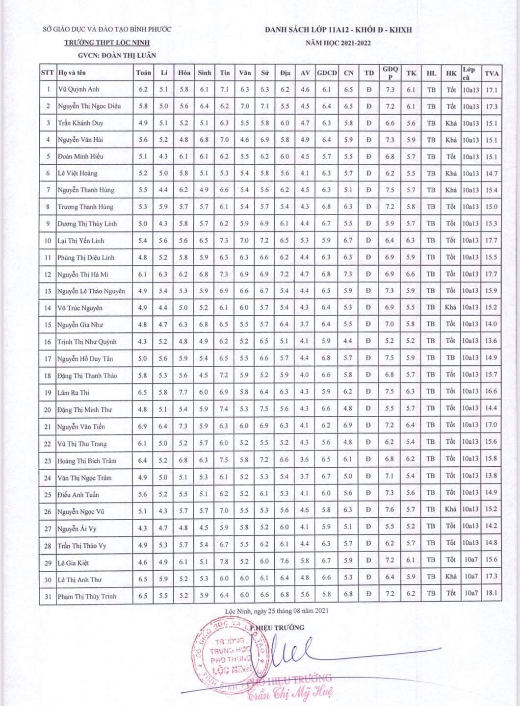 Danh sách lớp học năm học 2021-2022