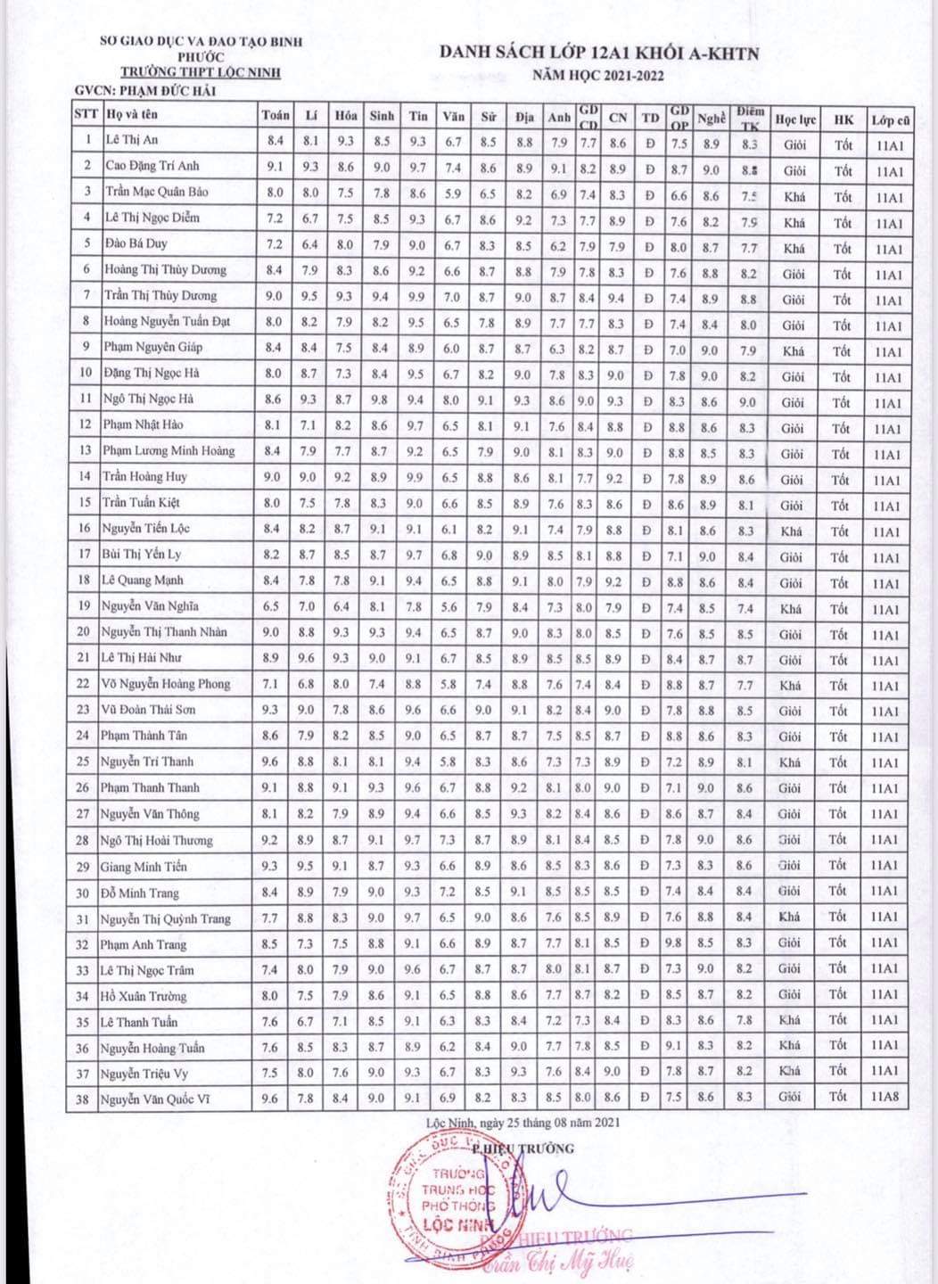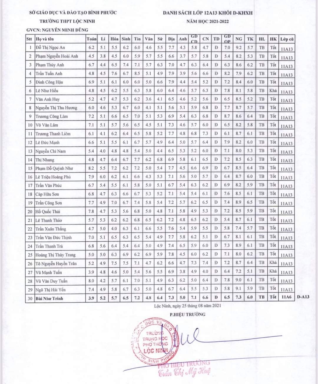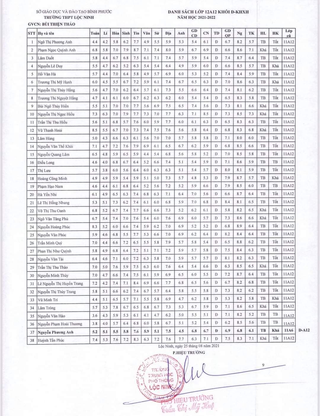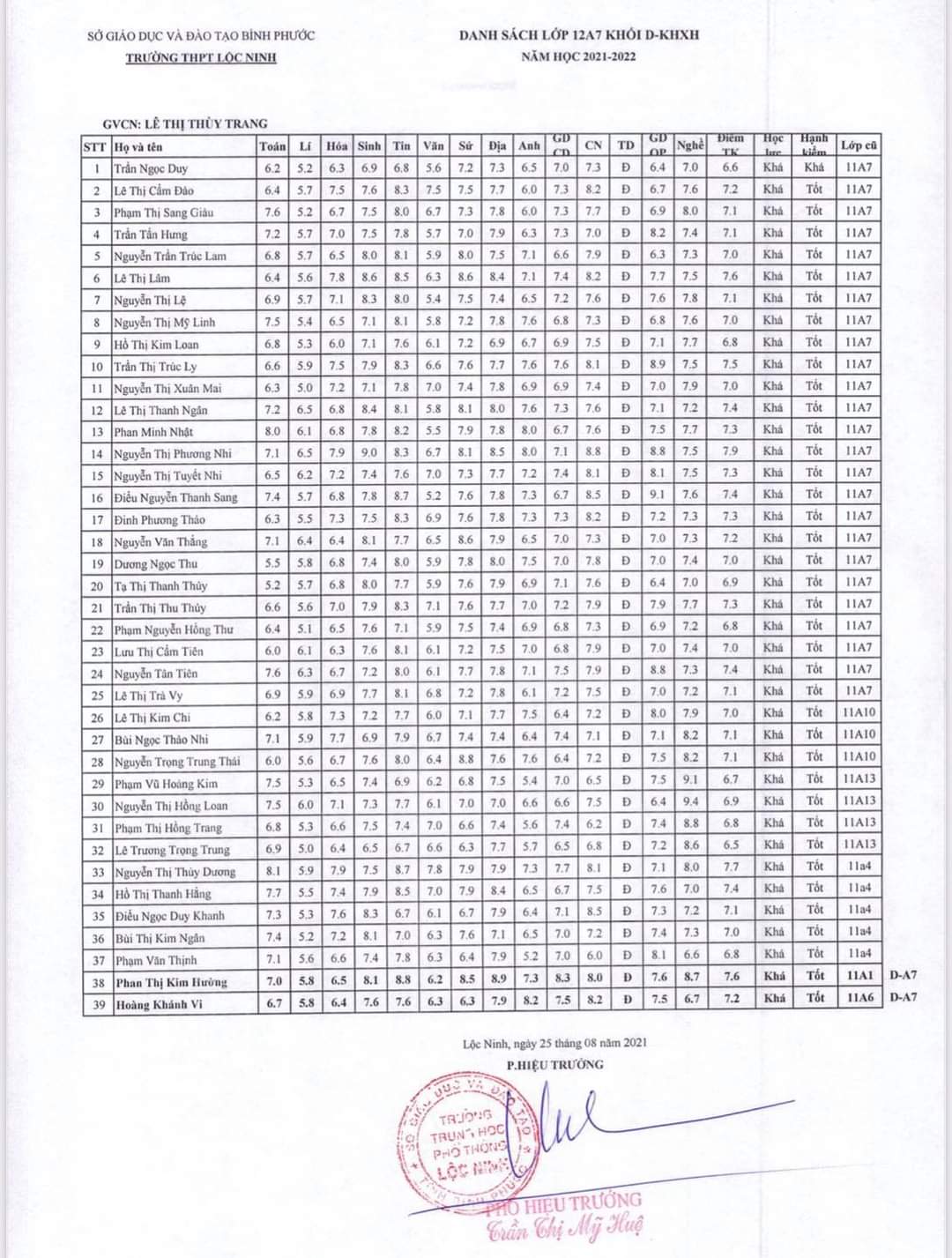Danh sách lớp học năm học 2021-2022
