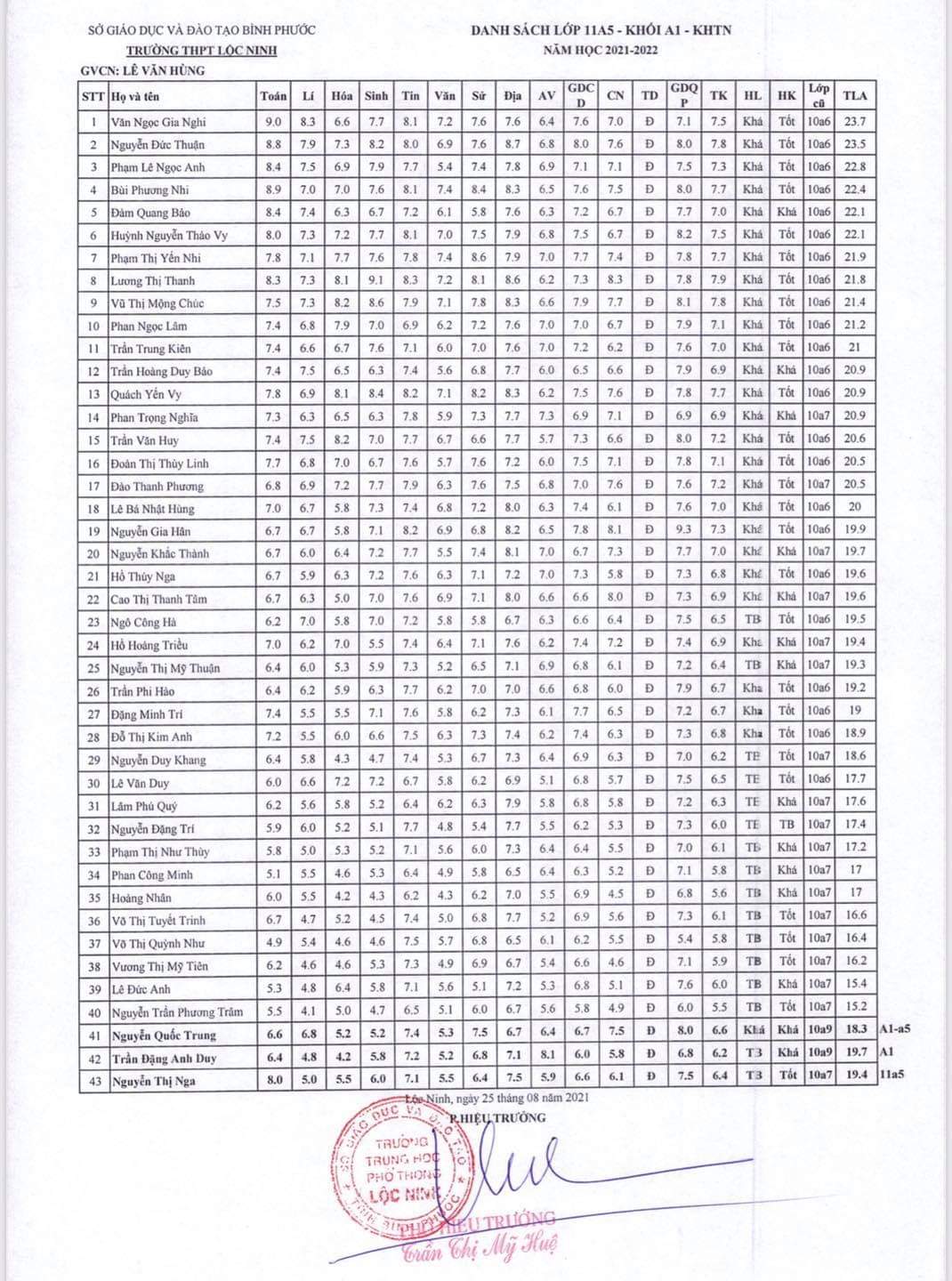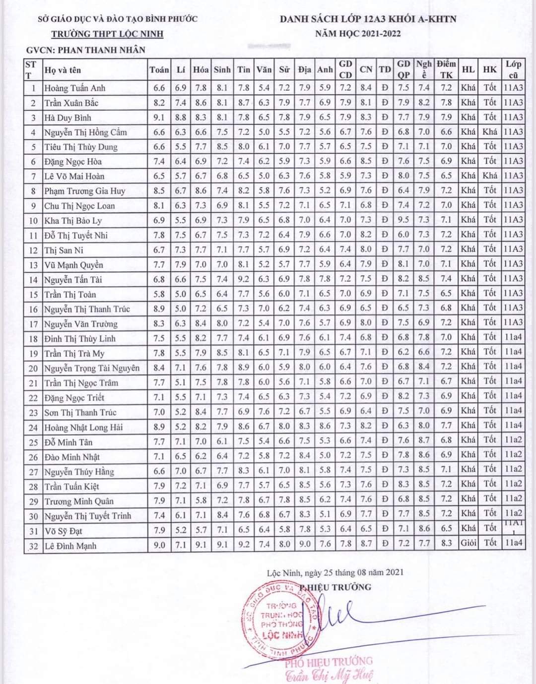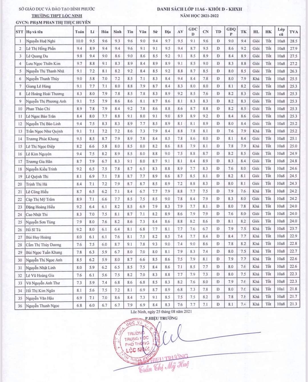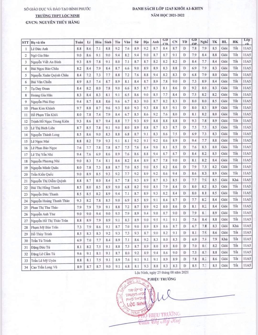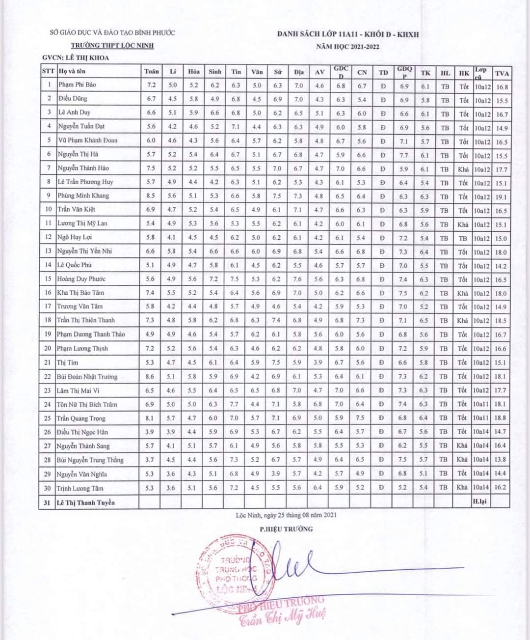 Danh sách lớp học năm học 2021-2022