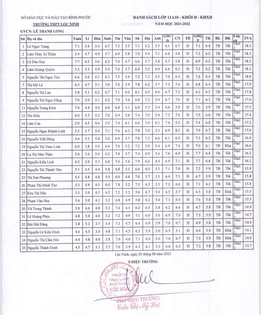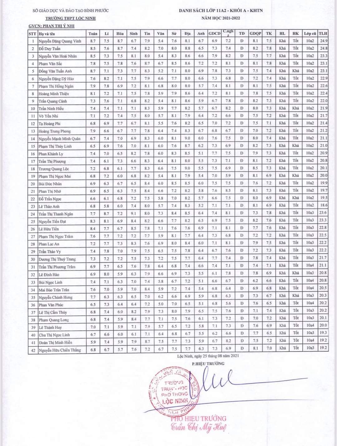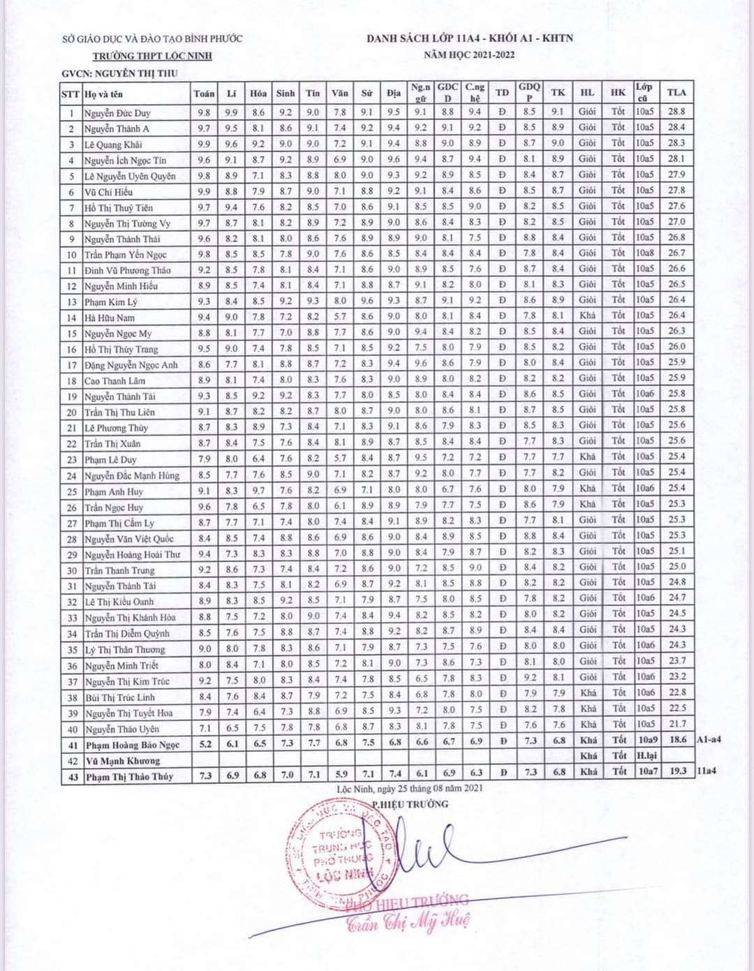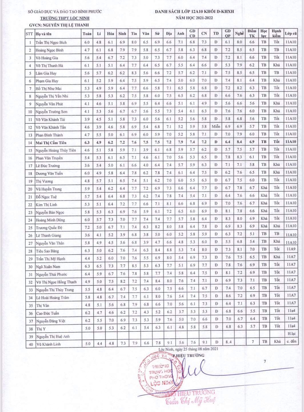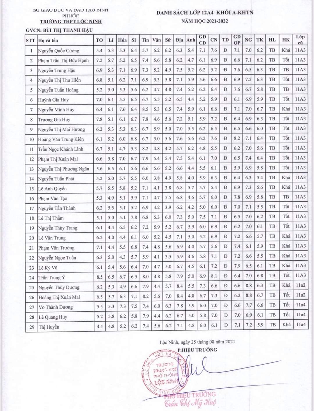 Danh sách lớp học năm học 2021-2022